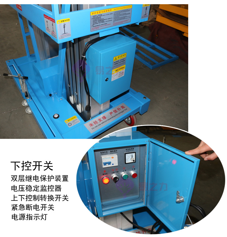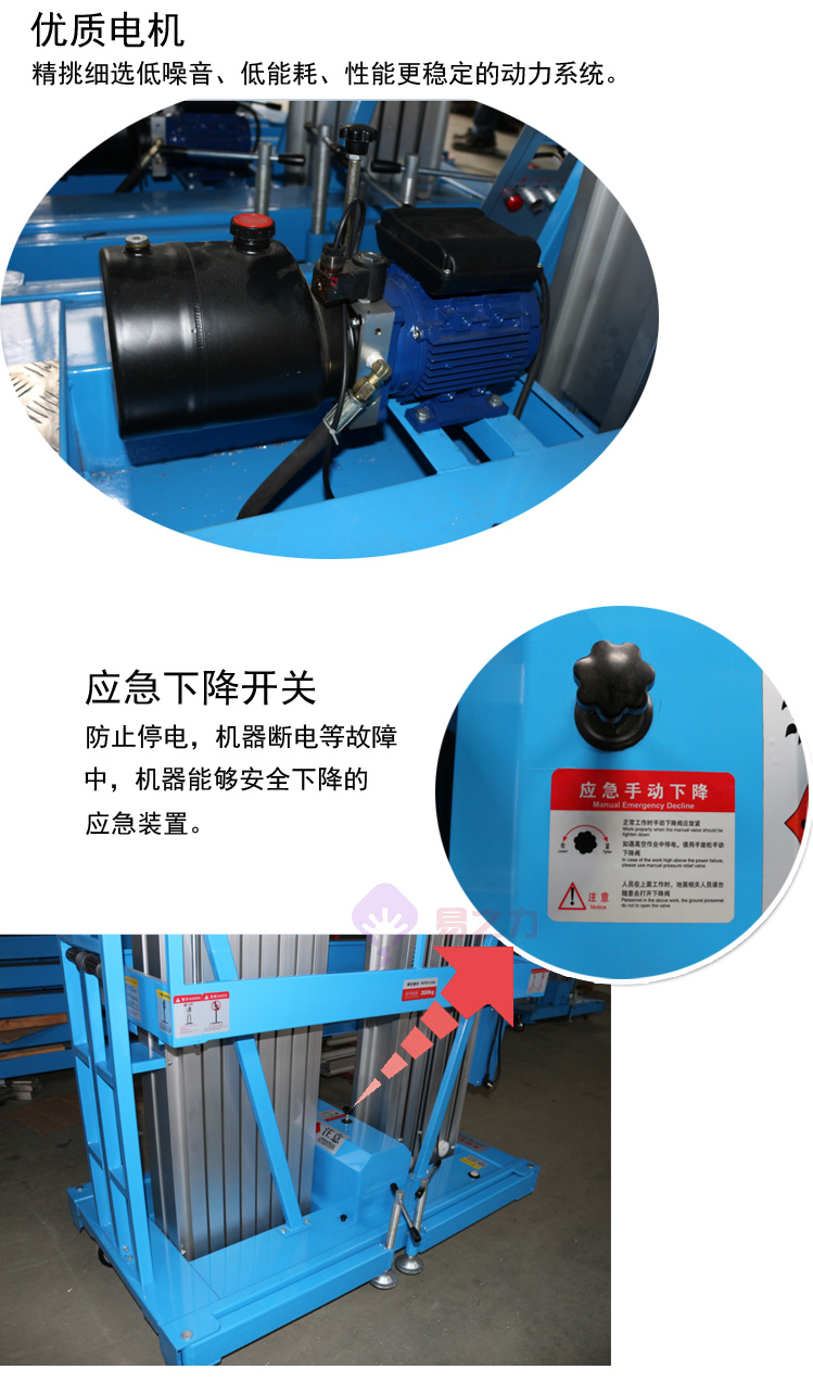液壓式鋁合金升降機(jī):全新設(shè)計(jì)的新一代產(chǎn)品,整體由高強(qiáng)度鋁型材精制而成。由于型材強(qiáng)度高,使升降臺(tái)的偏轉(zhuǎn)與擺動(dòng)極小。雙桅柱式的結(jié)構(gòu),載重量大,平臺(tái)面積大,穩(wěn)定性極好,運(yùn)轉(zhuǎn)靈活,推行方便。兩個(gè)桅柱提升平臺(tái),能適合兩人工作作業(yè),加強(qiáng)平臺(tái)穩(wěn)固性。它輕盈的外觀,能在極小的空間內(nèi)發(fā)揮最高的舉升能力。該升降機(jī)廣泛用于廠房、賓館、大廈、商場(chǎng)、車站、機(jī)場(chǎng)、體育場(chǎng)等場(chǎng)所?捎米麟娏路、照明電器、高架管道等安裝維護(hù),高空清潔等單人工作的高空作業(yè)。